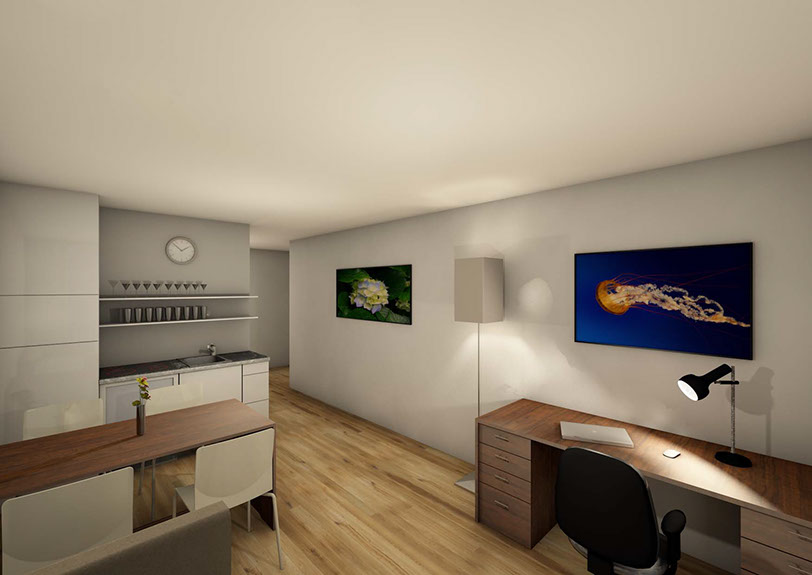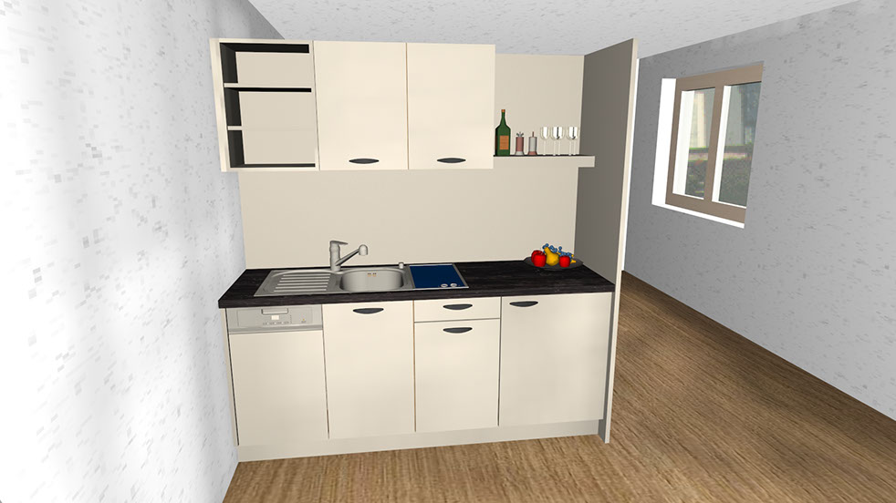 Durch die geschickte Anordnung eines raumteilenden Funktionsmöbels entstehen zwei separate Raumnischen zum Schlafen und Wohnen. Dadurch ist eine Vielzahl unterschiedlicher Wohnbedürfnisse individuell gestaltbar und kann, je nach persönlichen Vorlieben, ergänzt und genutzt werden.