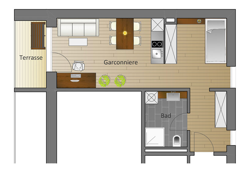 Zum Unterschied zu einer Zweizimmerwohnung und einem Zimmer in einer Wohngemeinschaft (WG) vereint eine Garconniere aufgrund ihrer Größe zwischen 35 und 40m²) Wohnfläche den Vorteil einer günstigeren Miete mit dem einer trotzdem eigenständig organisierten Wohneinheit.