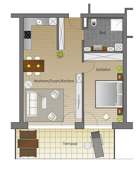 Der großzügige Wohn-Essbereich kann individuell eingerichtet werden. Ein separates 15m2-großes Schlafzimmer bietet den „getrennten“ Komfort. Im Erdgeschoss wertet diese Wohnung noch eine großzügige südseitig gelegene Terrasse auf, die sowohl vom Wohn/Ess-Bereich als auch vom Schlafzimmer zugänglich ist.