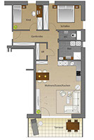 One apartment of this type has additionally a spacious terrace of 37m2 which is facing south-west. It is accessible from the living and dining area as well as from the bedroom.
